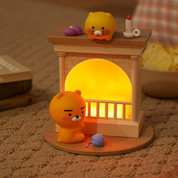 카카오프렌즈의 벽난로 불멍 무드등 라이언&춘식이 ^는 인테리어 소품으로도 훌륭한 제품으로 안전하고  따뜻한 집 안에서 라이언, 춘식이와 불멍을 즐길 수 있다. 벽난로 무드등이 방 안을 따스하게 밝혀주며 손 이 시린지 벽난로 앞에서 불을 쬐고 있는 라이언과 그 _ 모습을 위에서 지켜보고 있는 춘식이가 사랑스러움을 유발한다. 춘식이 옆에 있는 촛불을 꾹 누르면 가운데 벽난로 불이 점등된다.