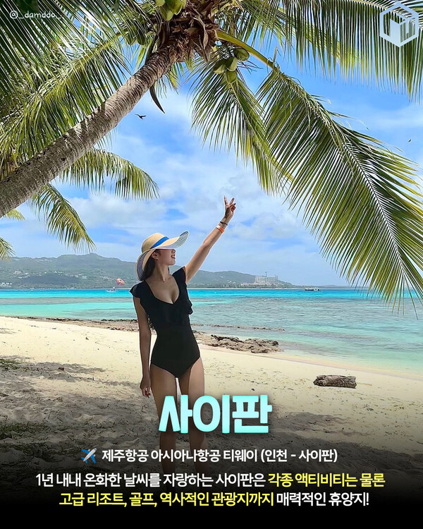 1년 내내 온화한 날씨를 자랑하는 사이판은 각종 액티비티는 물론 고급 리조트, 골프, 역사적인 관광지까지 매력적인 휴양지입니다. 특히 남녀노소 누구나 만족할 만한 인프라들이 잘 마련되어 있어 가족 여행으로 추천드리는 휴양지입니다.