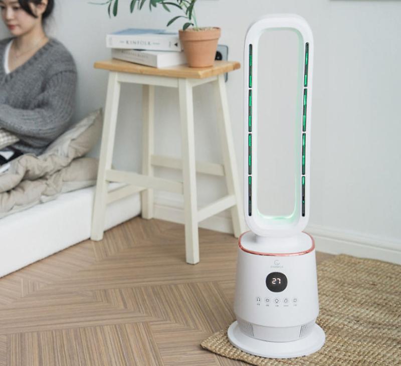 이노크아든 날개 없는 온풍기'는 분출구가 하단부부 터 세로로 만들어져, 밑의 공기부터 따뜻하게 데울 수 있는 제품이다. 좌우 회전을 통해 넓은 범위를 더 빠 르게 데울 수 있으며, 16°C에서 36°C까지 원하는 온 도를 자유롭게 설정할 수 있다. 7가지의 무드등을 지 원해 감성까지 채울 수 있는 슬림형 타워 온풍기다.
