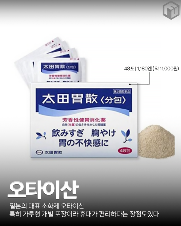 일본의 대표 소화제로, 7가지 생약과 4종의 제산제, 소화효소로 이루어진 복합기능소화제 오타이산입니다.