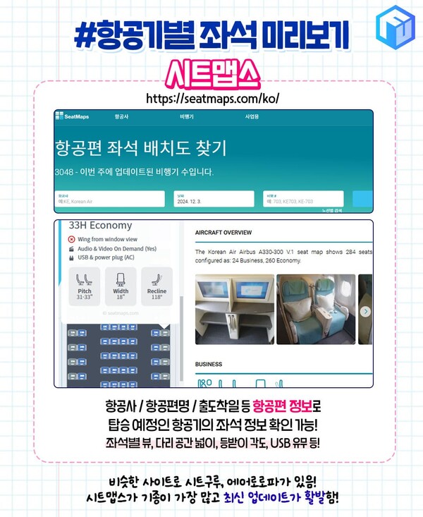 비행기 좌석 배치도는 시트맵스와 에어로로파, 시트구루 등 비행기 좌석 사이트를 통해 확인할 수 있습니다. 지난 추천 글과 달리, 이번 비행기 좌석 추천 글에서 에디터가 추천드릴 비행기 좌석 사이트는 '시트맵스'입니다.