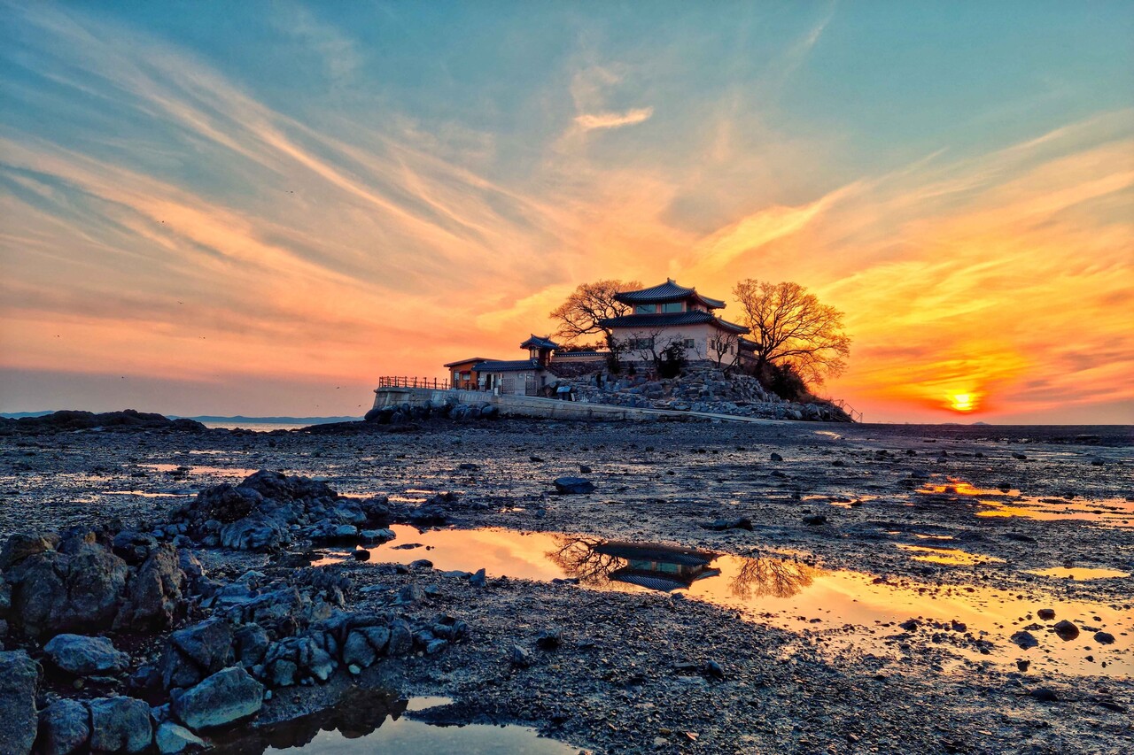 충남 서산시에 위치한 간월암은 서해 일출을 감상하기 좋은 독특한 장소인데요. 이 암자는 밀물과 썰물에 따라 섬과 육지를 오가는 모습으로, 마치 신선이 잠시 쉬었다 가는 곳처럼 신비로운 풍경을 자아내죠. 새벽, 바다 위로 떠오르는 붉은 태양과 고즈넉한 암자의 조화는 일출 명소로서 간월암을 더욱 빛나게 합니다.