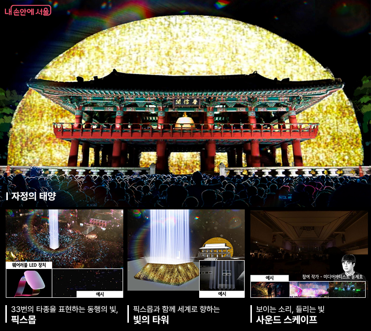 특히 이번 보신각 타종 행사에서는 역대 최대 규모의 ‘제야의 종 타종 행사’를 개최한다고 하는데요. 1만 5,000여 명의 시민들이 직접 참여하는 대규모 ‘픽스몹(관객이 착용하는 LED 팔찌를 무선 제어하는 조명 기술)’ 퍼포먼스를 중심으로 ‘참여형 새해맞이 축제’로 준비되었다고 합니다. 이 외에도 다양한 빛 관련 행사가 진행되니 참고하세요.
