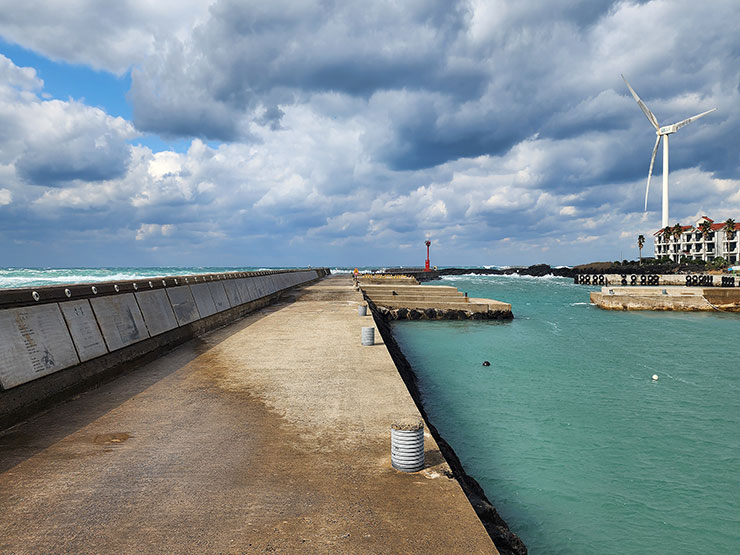 왼쪽으로 방파제 벽이 높으니 오른쪽 월령포구의 물색을 보며 걸어보는 것, 물색을 바라보는 것, 바닥까지 보이는 투명함과 건너편으로 보이는 숙박시설 그리고 풍차까지 그림처럼 예쁘다.