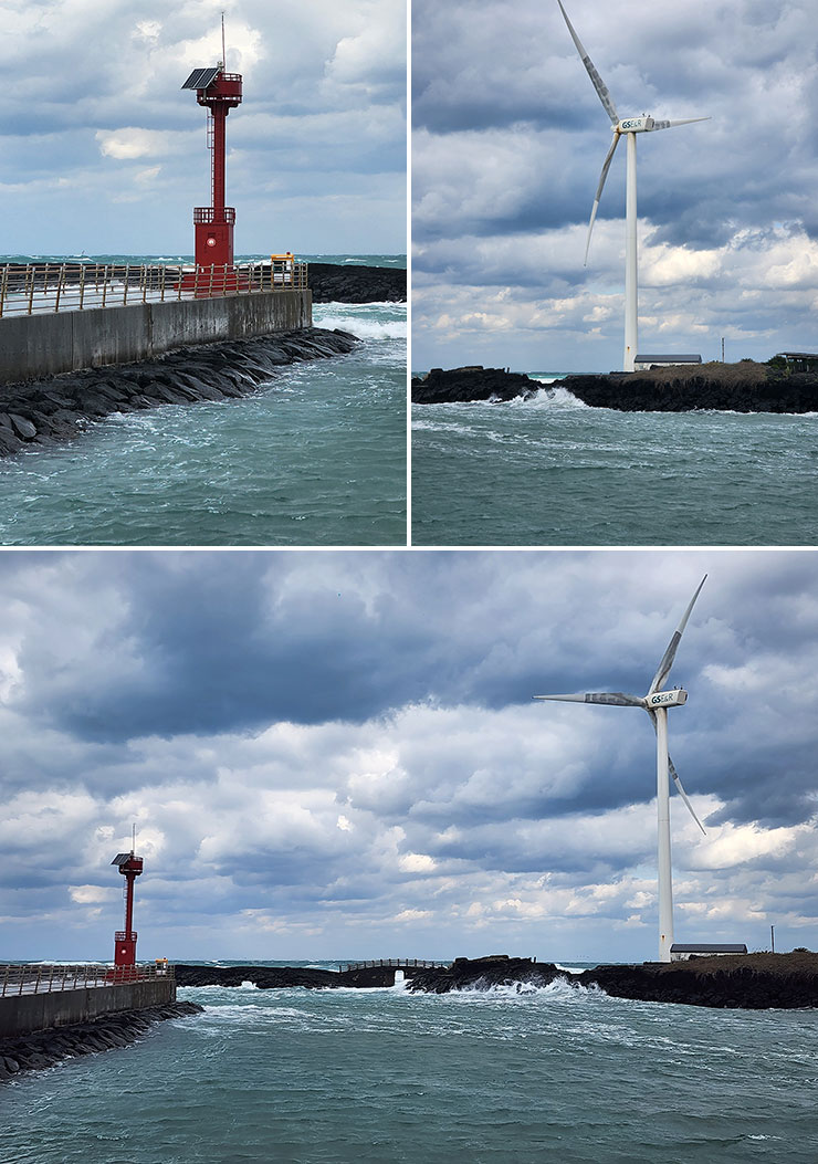 뒤집어질 듯 밀려드는 파도와 벌써부터 바람에 뒤집어져 하얀 포말로 하늘을 날아오르는 하얀 포말까지 막아내는 방파제의 능력치가 멋지게 보인다.