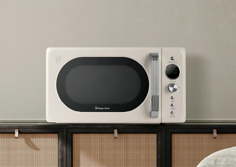 매직쉐프의 무회전 전자레인지는 부드러운 곡선과 감 각적인 색상, 그리고 버튼부의 포인트가 눈에 띄는 제 품이다. 20L 용량의 제품으로, 내부 공간이 넓어서 대형 도시락도 쉽게 넣을 수 있다. 기름때가 잘 스며 들지 않는 이지클린을 적용해 얼룩을 쉽게 지울 수 있 다. 최대 출력은 700W로, 강력한 고주파 출력을 활 용해 빠르고 간편하게 다양한 음식을 조리할 수 있다.