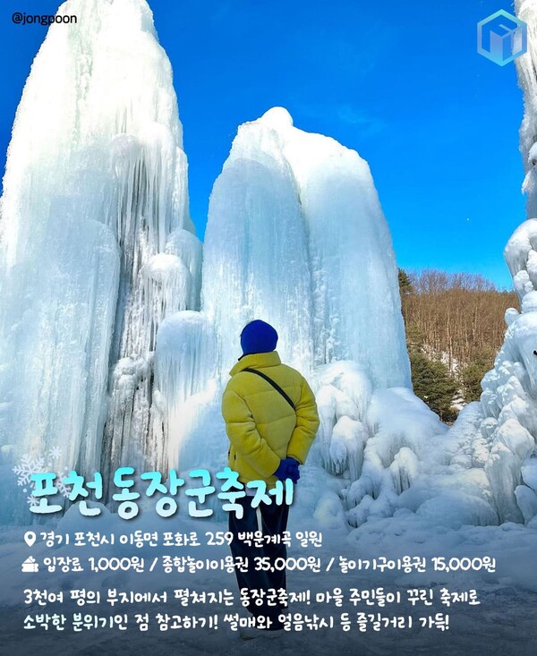 백운계곡 인근 마을 주민들이 기획하고 꾸려온 축제인 포천 동장군축제에서도 빙벽을 볼 수 있습니다. 동장군축제는 겨울철 포천을 대표하는 2대 축제로 손꼽히는데요. 다양한 종류의 눈썰매와 얼음과 눈 조각, 다채로운 겨울 먹거리와 즐길거리가 풍성해 온가족이 즐기기 좋은 축제입니다.