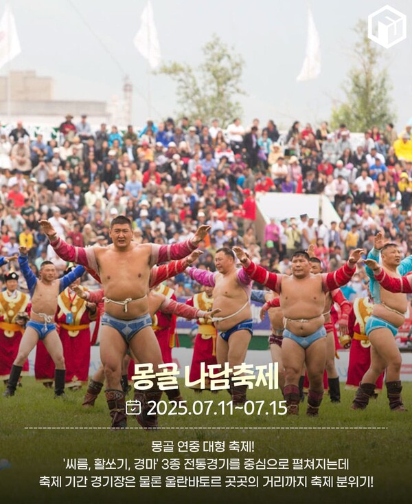 몽골의 수도 울란바토르에서 매년 7월 11일부터 진행되는 나담축제는 몽골을 대표하는 유목문화 축제입니다. 축제기간 전국민이 나담축제를 즐기며 시내는 떠들썩한 분위기가 형성되는데요. 축제는 3종 전통경기인 '씨름', '활쏘기', '경마' 경기를 중심으로 펼쳐집니다.