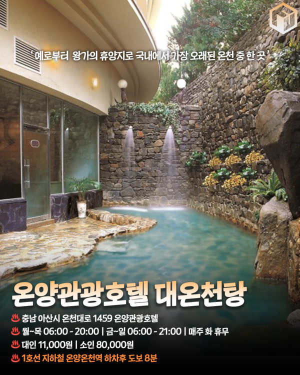국내에서 가장 오래된 온천이자 왕가의 휴양지로도 유명한 천안 아산역 온양온천입니다. 온양온천 대온천탕은 알칼리성 온천으로 피부 미용에도 탁월한 효과으로 잘 알려져있습니다,