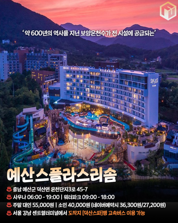 약 600년의 역사를 지닌 유서깊은 덕산 스플라스리솜입니다. 덕산 스플라스리솜는 보양온천수가 전 시설에 공급되는 국내 몇 없는 보양온천입인데요. 온천은 물론 워터파크에도 모두 온천수가 공급되고 사우나등 각종 부대시설도 다양합니다.