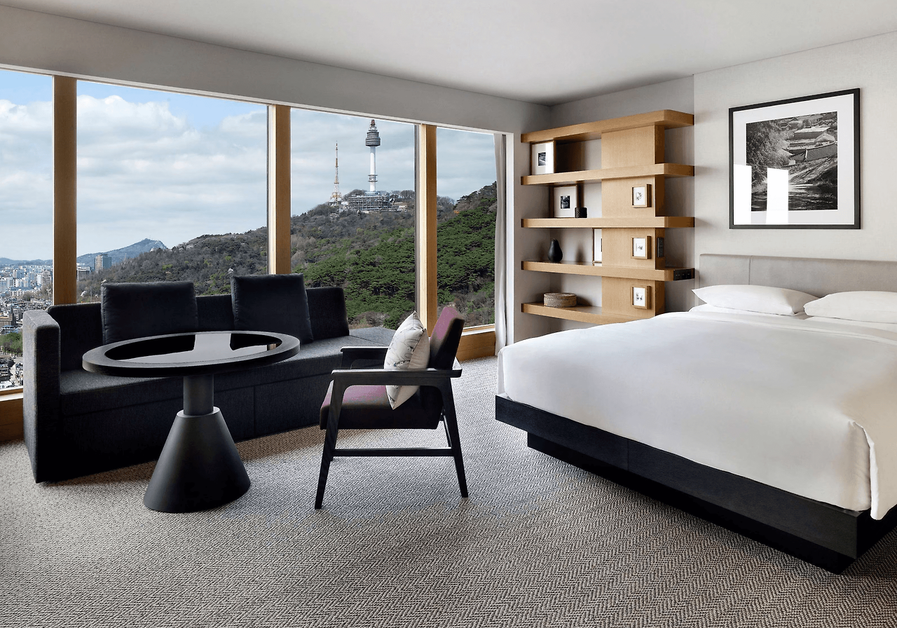 그랜드 하얏트 서울의 객실은 54개의 스위트룸을 포함해 총 616개의 객실을 보유하고 있습니다. 한국 고유의 전통 문화에서 영감을 얻은 인테리어로 안락하고 현대적인 분 위기를 연출했습니다. 객실 옵션은 리버뷰와 마운틴뷰로 나뉘며 남산을 더욱 가까이에서 감상하고 싶다면 마운틴 뷰 코너룸을 추천해드려요. 넓은 통창 앞에 마련된 소파 베드에서 아름다운 남산의 아름다운 전경을 즐길 수 있답 니다.