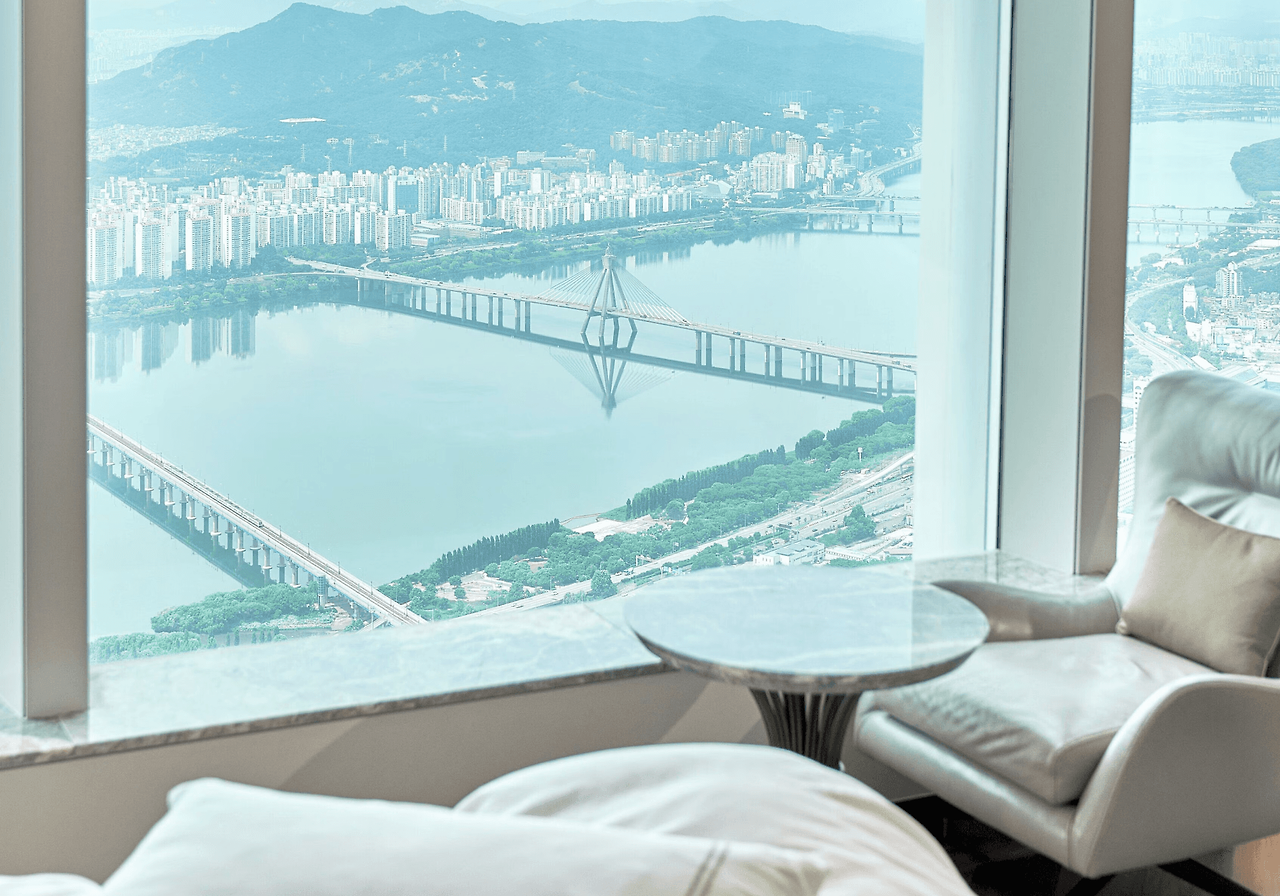 101층까지 자리해 있어요. 객실 타입은 그랜드 디럭스룸 부터 프리미어룸, 스위트룸으로 나뉘며 한강뷰, 시티뷰 중 선택할 수 있는데요. 추천 객실은 리버뷰 프리미어룸 으로, 클래식하고 우아한 인테리어가 돋보이는 객실! 딥 디크 브랜드의 어메니티와 게스트 라운 지 무료 이용권 등이 포함돼 있어 더욱 럭셔리한 투숙 경험을 제공해 드 려요. 야경과 함께 하루를 마무리하 고 싶다면 욕실 뷰 업 그레이드를 요청할 수도 있습니다.