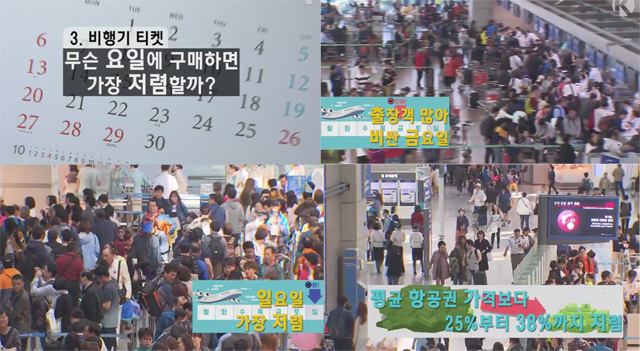 빅데이터 분석 결과에 따르면 출장객이 가장 많은 금요일에 예약하면 가장 비싼 것으로 알려졌다. 반면 일요일은 직장인들이 많지 않아 가장 저렴하다. 일요일날 비행기 예약을 하게되면 평균 가격보다 25%에서 38% 까지 싸게 살 수 있으니 일요일날 예약하는 것이 최저가 항공권을 구하기 쉽다.