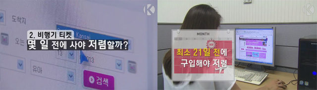 비행기 티켓은 최소 21일 전에 구입해야 가장 저렴하다. 유럽이나 미국 등 멀리 갈 경우는 3~6개월 이전도 저렴한 것으로 알려졌다. 너무 일찍 예약을 할 경우 좌석이 다 열리지 않은 상태에서 비싼 좌석으로 예약할 수도 있기 때문에 타이밍이 중요하다. 2016 빅데이터 분석결과 일반적으로는 21일 전이 가장 저렴한 것으로 밝혀졌다.