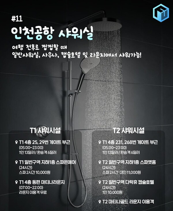 특히 제2터미널 다락휴애서는 객실 예약을 하지 않았더라도 24시간 샤워 시설만 이용이 가능합니다. 1인당 1만원의 요금으로 이용할 수 있으며 수건과 샤워 용품 등이 제공됩니다.