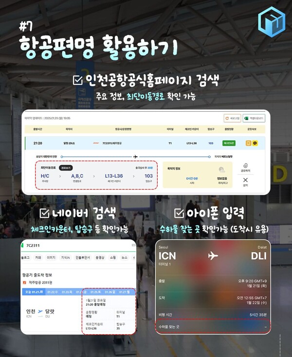 인천공항 홈페이지에서는 최단 이동경로를 볼 수 있어 공항 도착 직전에 항공편명 검색을 활용하는 것이 좋습니다. 네이버 검색은 체크인 카운터와 탑승구 정보를 확인할 수 있어 면세구역으로 진입해 탑승구를 빠르게 찾아볼 수 있죠.