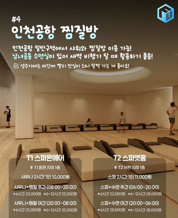 2025년 1월, 제2터미널에 사우나 시설인 '스파앳홈'이 오픈하며 이제 인천공항 모든 터미널에서 사우나와 찜질방 이용이 가능합니다. 최근에 오픈한 2터미널 스파앳홈이 확실히 더 쾌적한 시설로 평가받고 있죠.