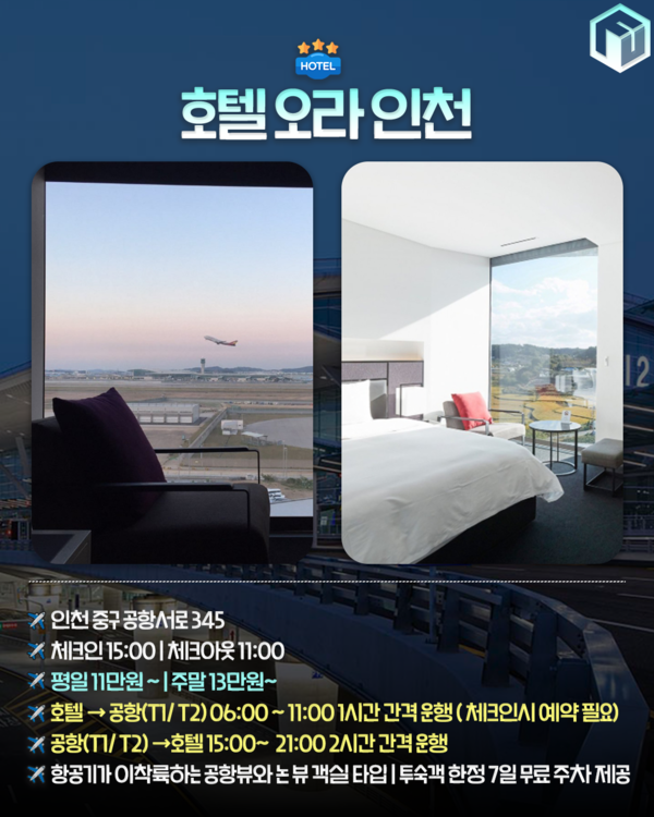 인천공항 제2여객터미널 맞은편에 위치한 호텔 오라 인천 입니다. 공항 바로 앞에 위치해 항공기가 이착륙하는 뷰를 감상가능한 호텔이기도 합니다. 공항 셔틀버스의 경우 오전 6시부터 11까지 1시간 간격으로 운행을 해 이외에 시간에는 택시나 버스, 도보를 이용하셔야합니다.