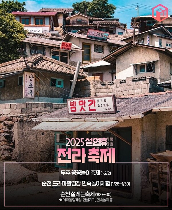 2025 설 연휴기간 전라지역의 축제는 3개입니다. 무주에서는 꽁꽁놀이축제가, 순천 드라마촬영장에서는 민속놀이체험장이 마련될 예정인데요. 순천 중심부에서 진행되는 설레는 축제는 연휴 내내 에어볼링게임, 연날리기, 민속들이 등 가족단위로 즐기기 좋은 놀이체험장에서 즐거운 시간을 보낼 수 있습니다.